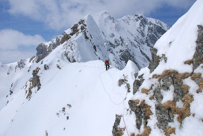 N-am nici o emotzie la trecerea pe cornisele de care ma temeam atat, deja ma simt intr-o poveste. Pentru sigurantza noastra preferam sa nu mergem concomitent, nu vrem sa riscam, mergem cap-secund, stim ca asta ne incetineste, dar preferam ca timpul sa curga mai repede, decat sa nu mai existe deloc pt noi ... Mergem cap schimbat ca sa economisim timp si cautam sa asiguram cam peste tot unde putem. Cand nu gasim tzancuri de stanca asiguram in zapada la 2 pioletzi.